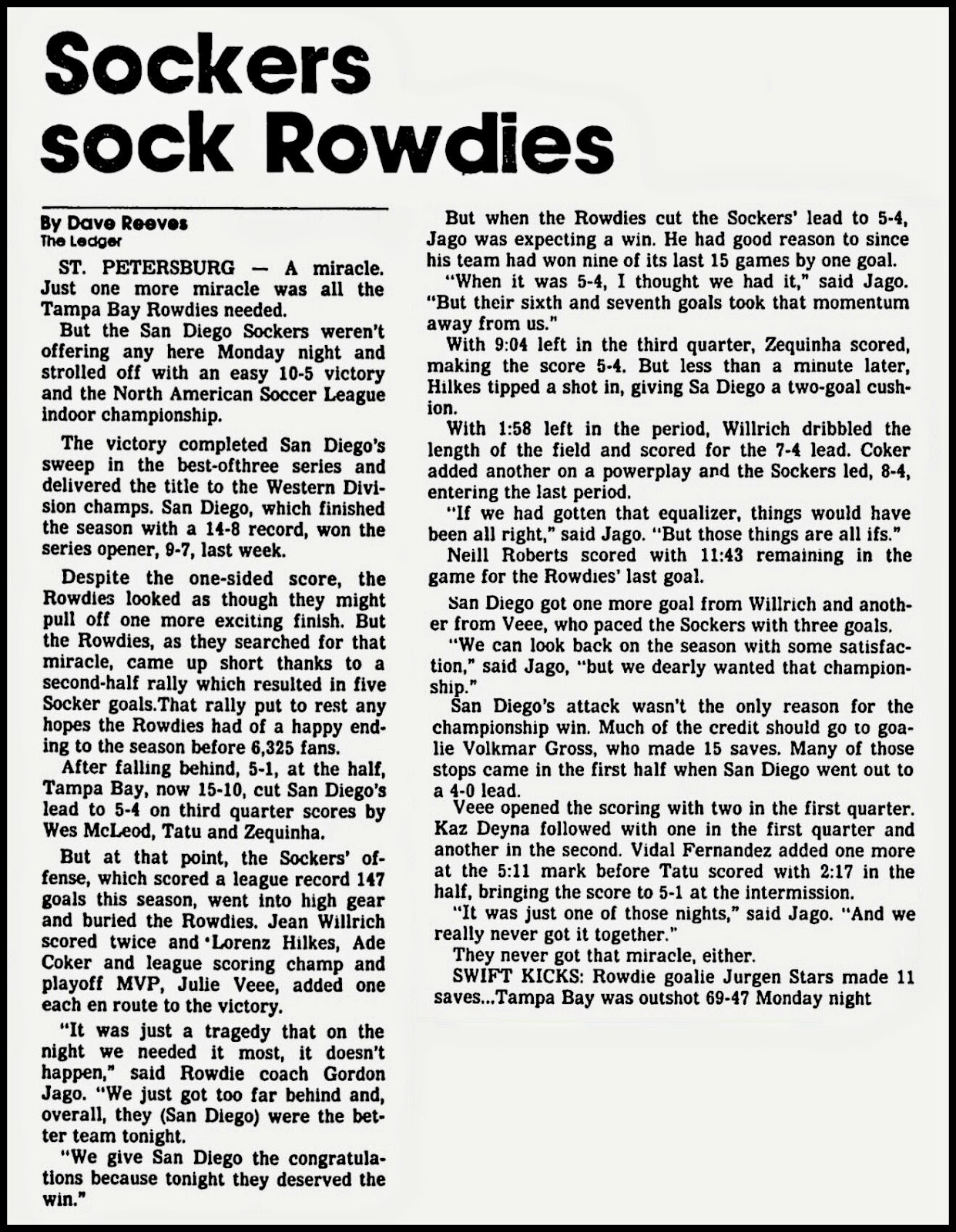 San Diego Sockers | - | Vancouver Whitecaps | 4 - 3 | 8 - 4 | x | February 19 -5,128 • February 21 -9,728 |